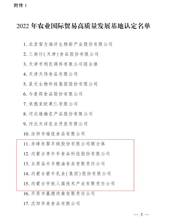 8月29日,農(nóng)業(yè)農(nóng)村部辦公廳印發(fā)《關(guān)于認(rèn)定2022年農(nóng)業(yè)國際貿(mào)易高質(zhì)量發(fā)展基地的通知》,認(rèn)定116個基地為2022年農(nóng)業(yè)國際貿(mào)易高質(zhì)量發(fā)展基地,其中,內(nèi)蒙古5家企業(yè)上榜。